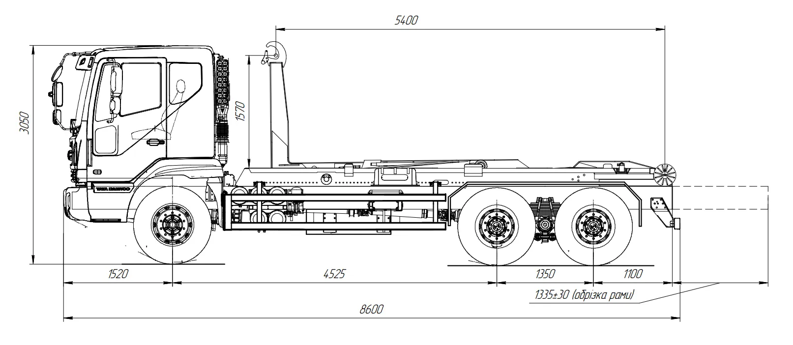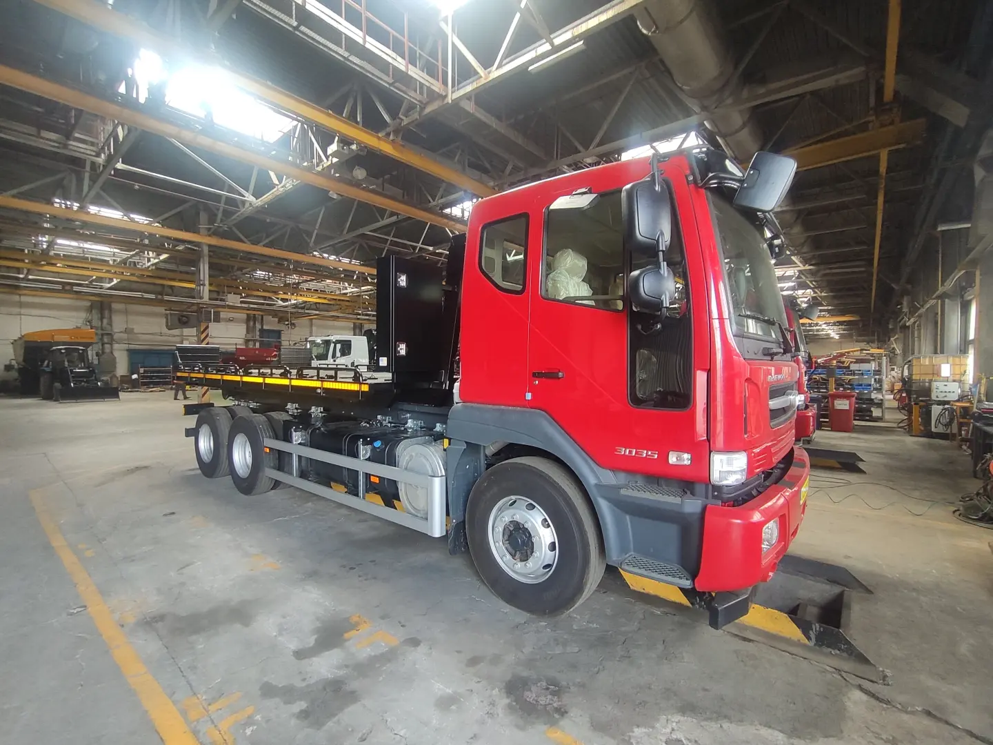 Базовое шасси DAEWOO CL6CF с колёсной формулой 6×4 обеспечивает надёжность и устойчивость при перевозке тяжёлых грузов. Полная масса автомобиля составляет 29 500 кг,