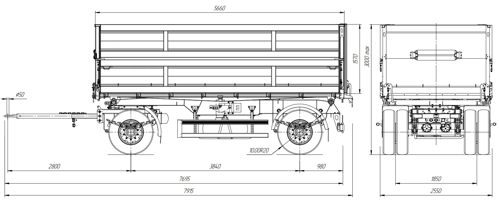 Причіп оснащений самоскидною вантажною платформою з розвантаженням на три сторони, що значно спрощує процес вивантаження продукції. Обʼєм платформи 20 м³